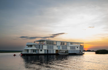 Moving along the banks of the great Chobe River, Zambezi Queen is a 5-star, 42-metre long luxury houseboat. It offers unparalleled sophistication in one of the most remote locations on the planet. On the vessel you can enjoy a unique and adventurous river safari holiday while surrounded by complete comfort and elegance.